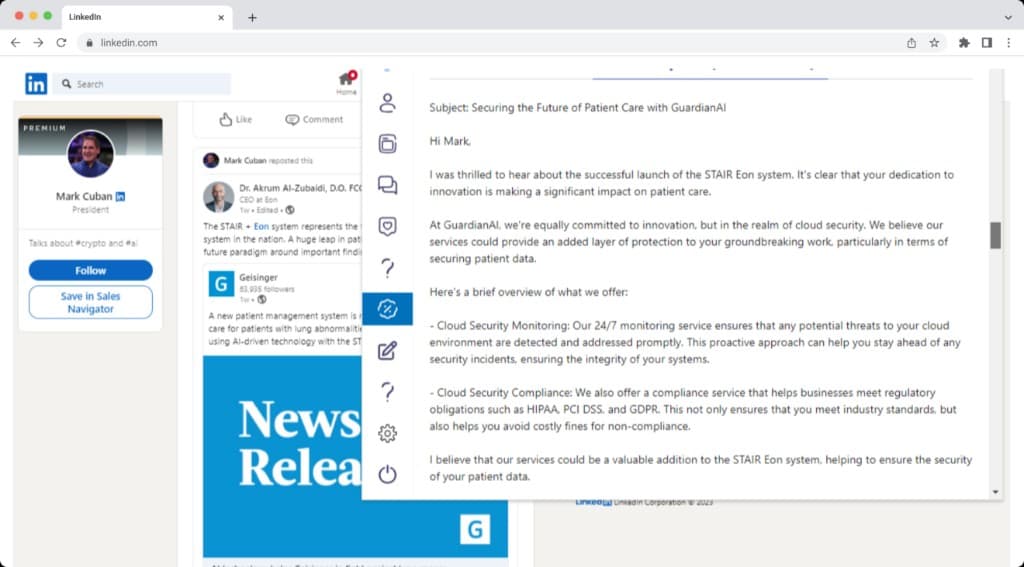 - AI-generated sales messaging with variables bound to the user’s career and skills and to each lead’s enriched profile